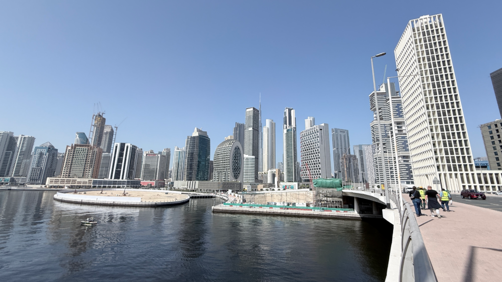 - Modern skyline of residential towers, office buildings, luxury hotels, and landmark developments like Bay Avenue, Executive Towers, and canal-front properties.